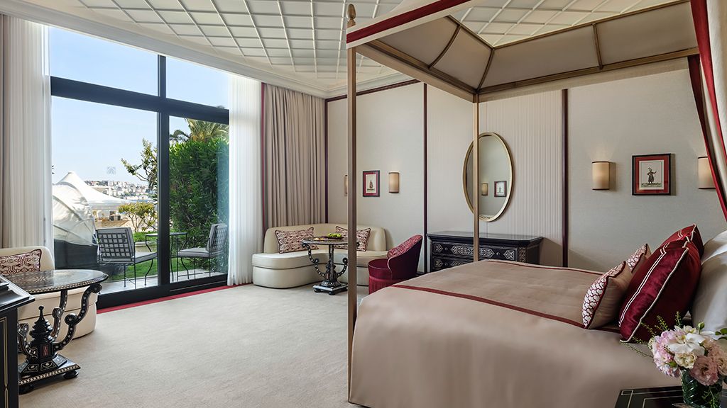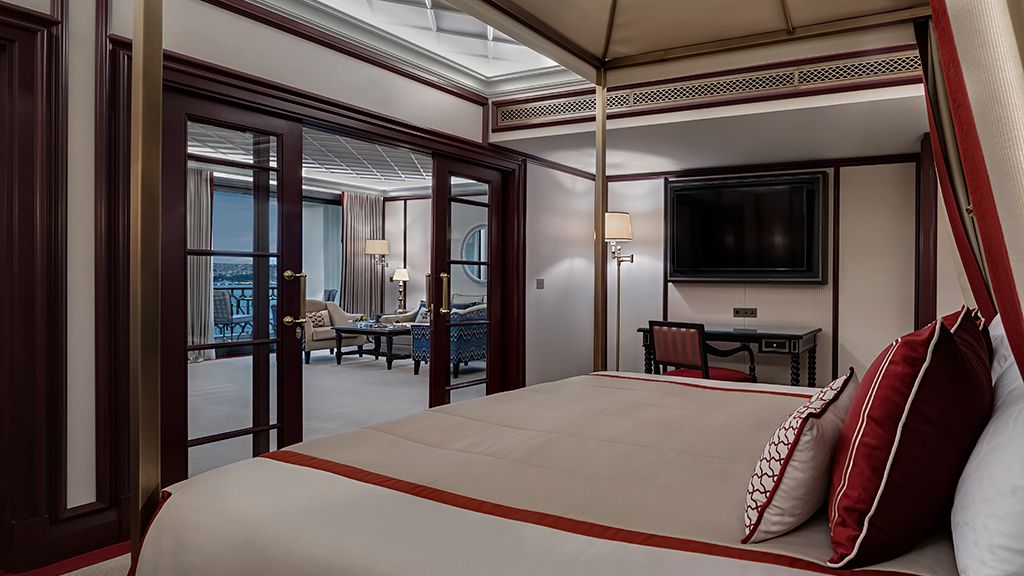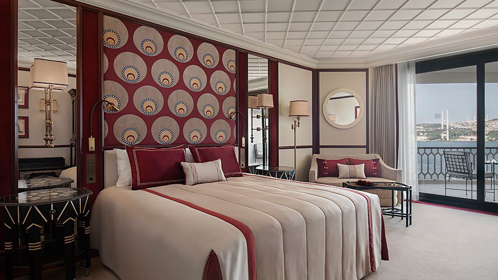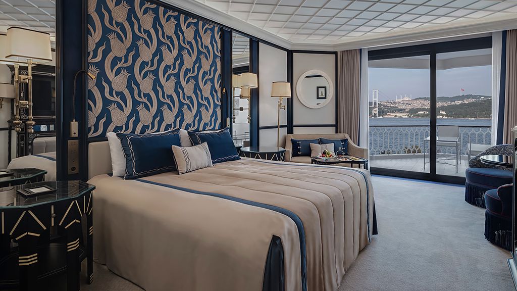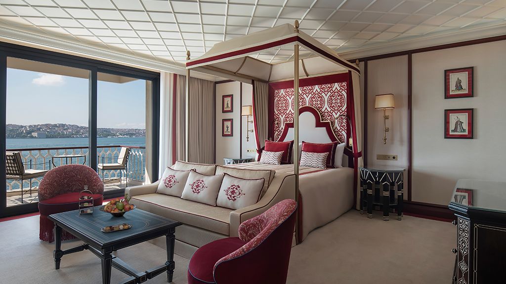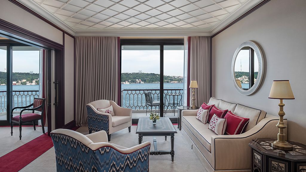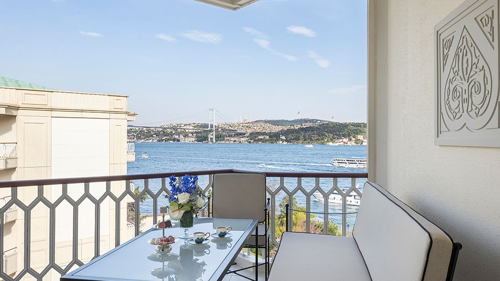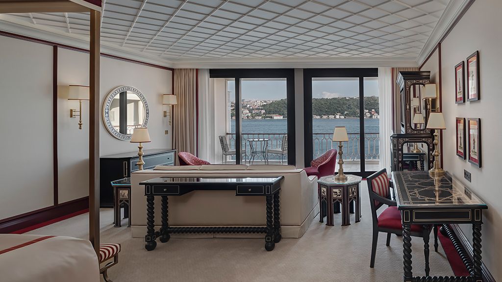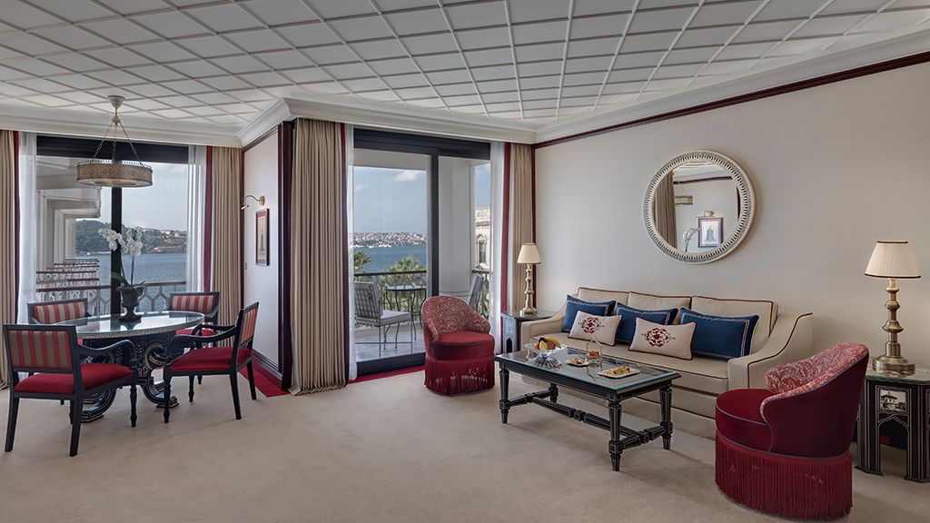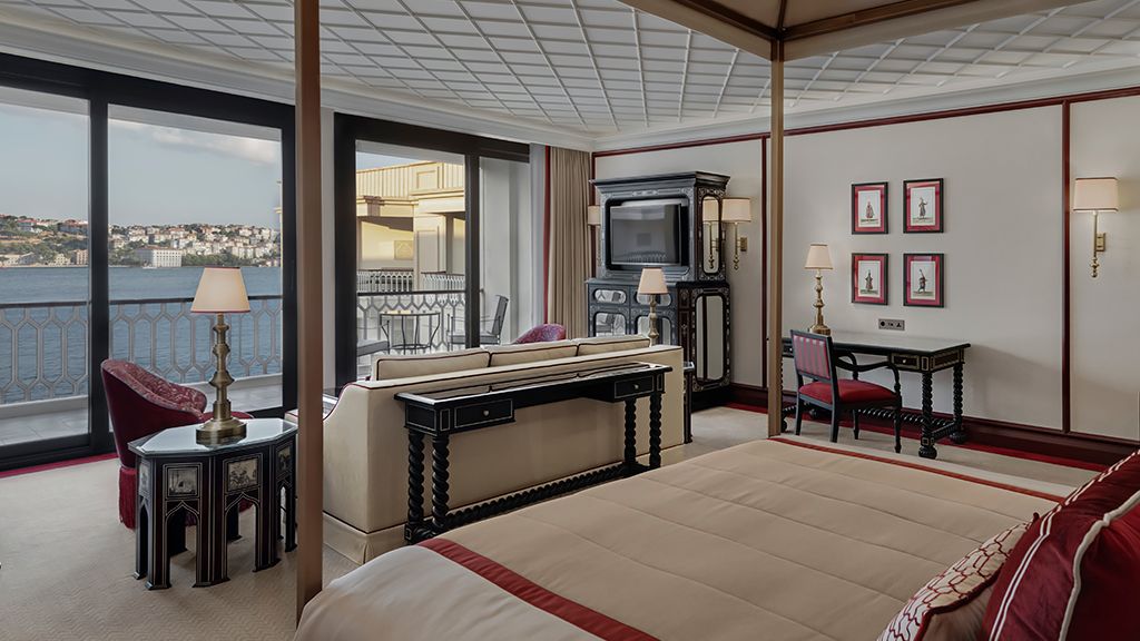 Bosphorus view - 1 King Bed. Totally redesigned with royal Ottoman architectural craftsmanship, these generously sized brand-new suites offer palatial elegance with an incredible Bosphorus vista. The suites have a specially crafted king-sized bed, a large balcony and a Turkish hammam-style marble bathroom. An elegant extended living room with lavish furniture creates a perfect combination of luxury and a stay of splendour.