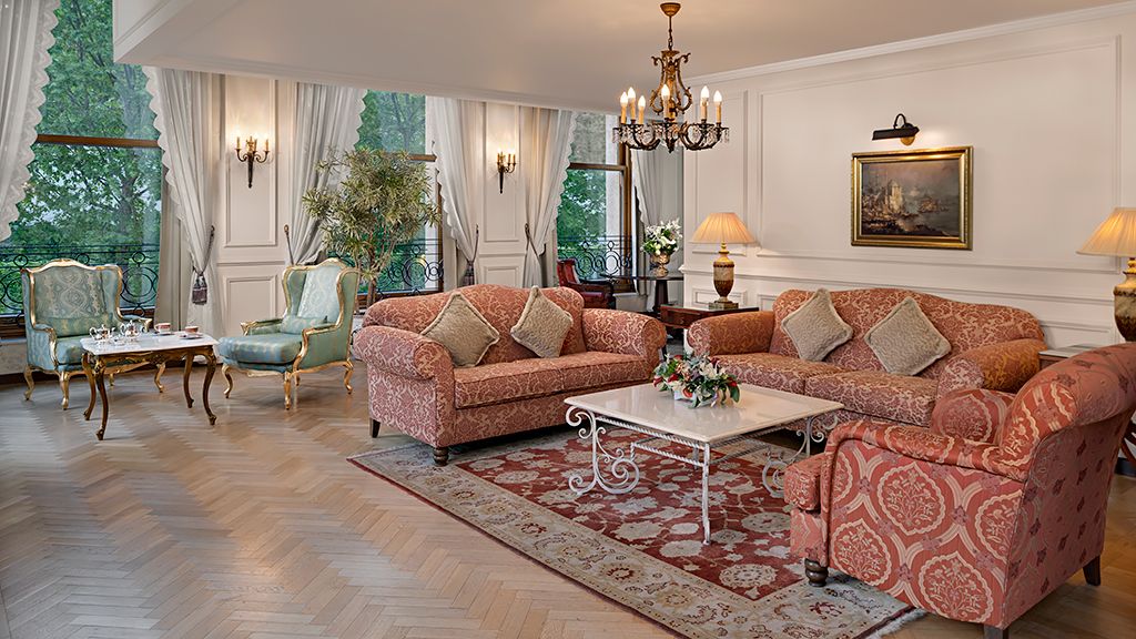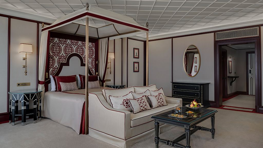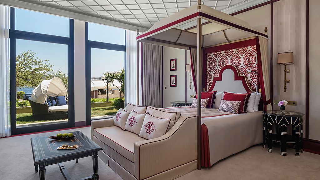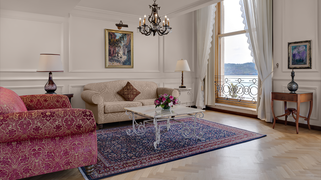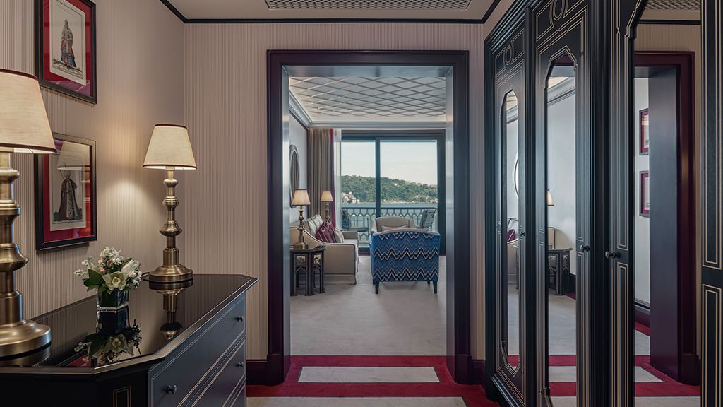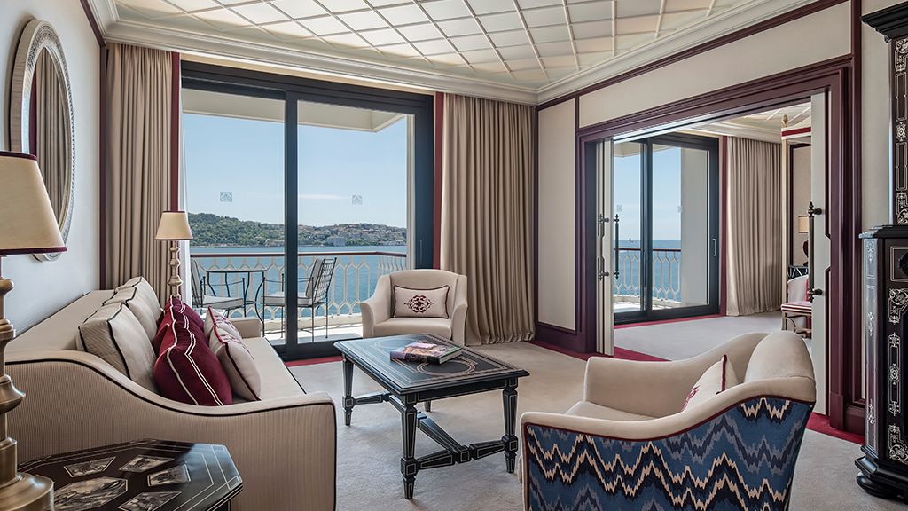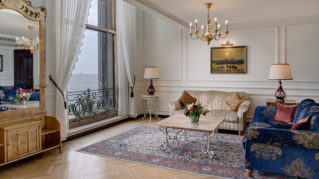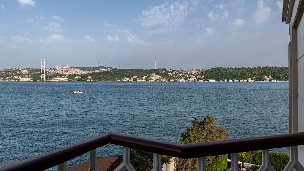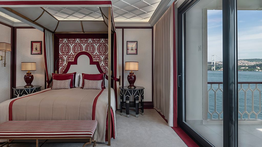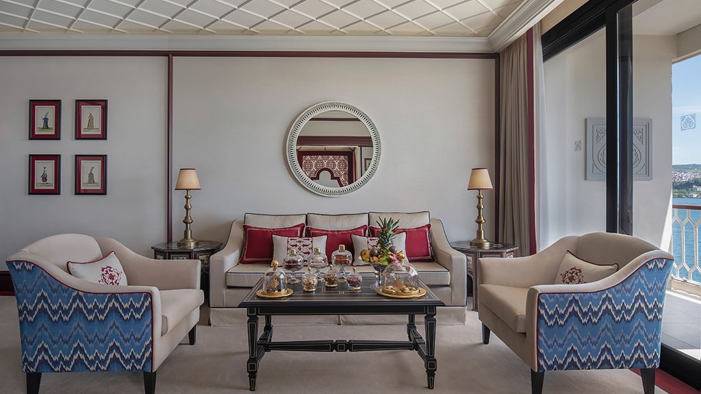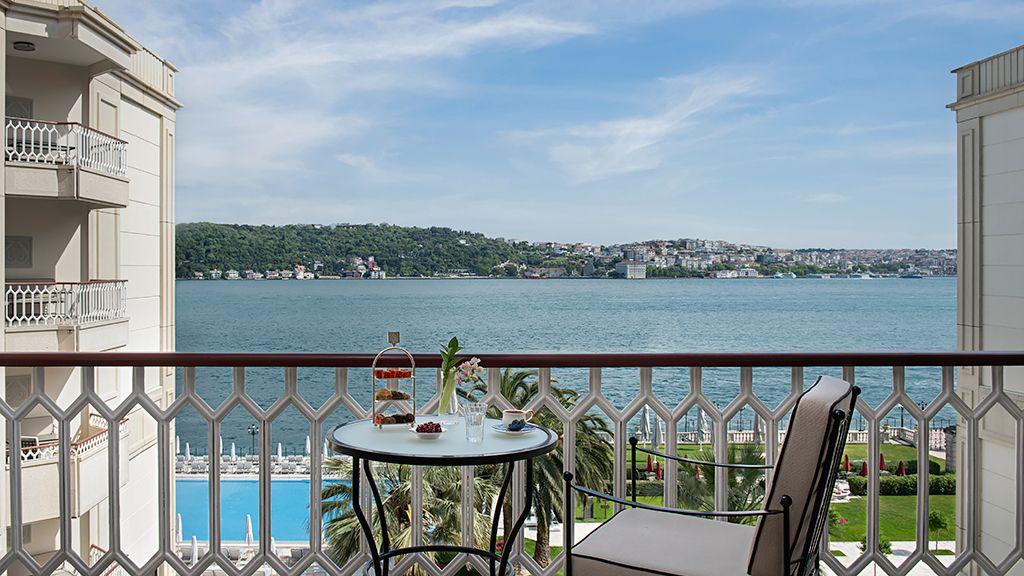 Bosphorus view - 1 King Bed. Totally redesigned with royal Ottoman architectural craftsmanship, these generously sized brand-new suites offer palatial elegance with an incredible Bosphorus vista. The suites have a specially crafted king-sized bed, a large balcony and a Turkish hammam-style marble bathroom. An elegant extended living room with lavish furniture creates a perfect combination of luxury and a stay of splendour.