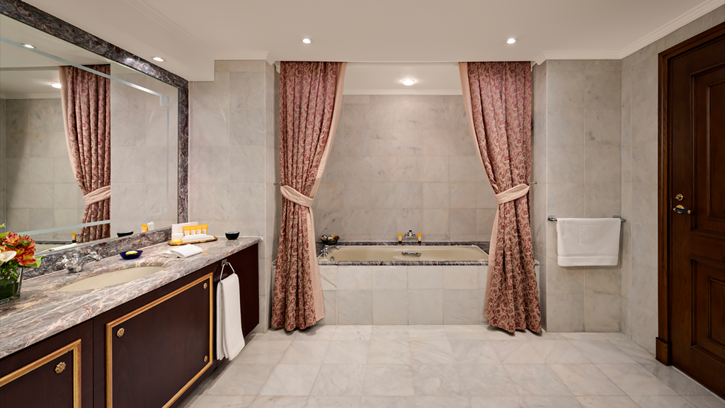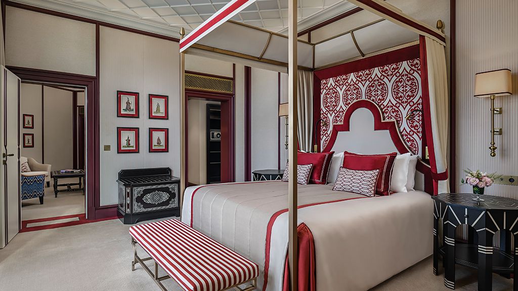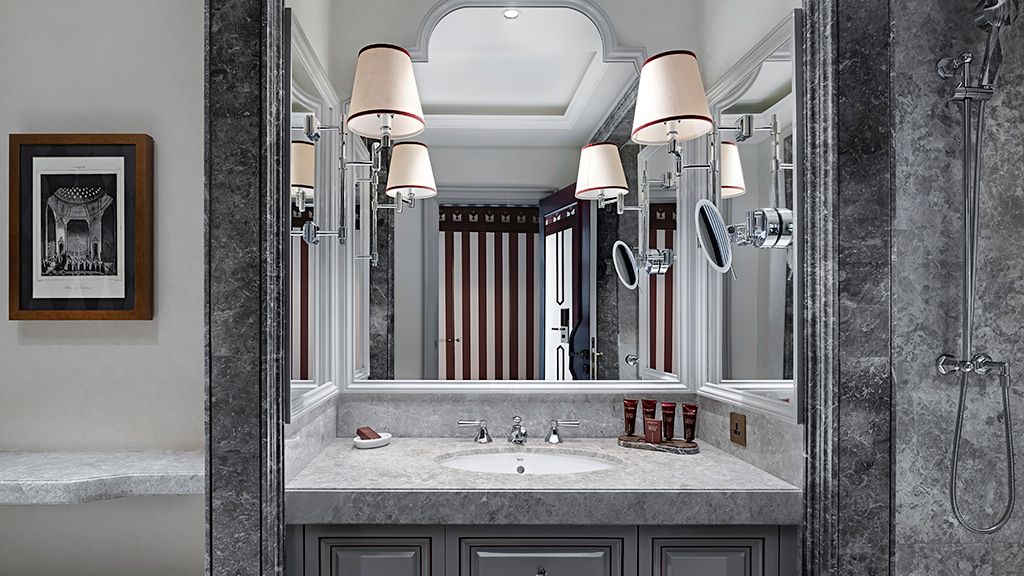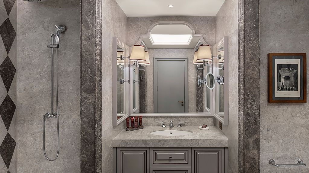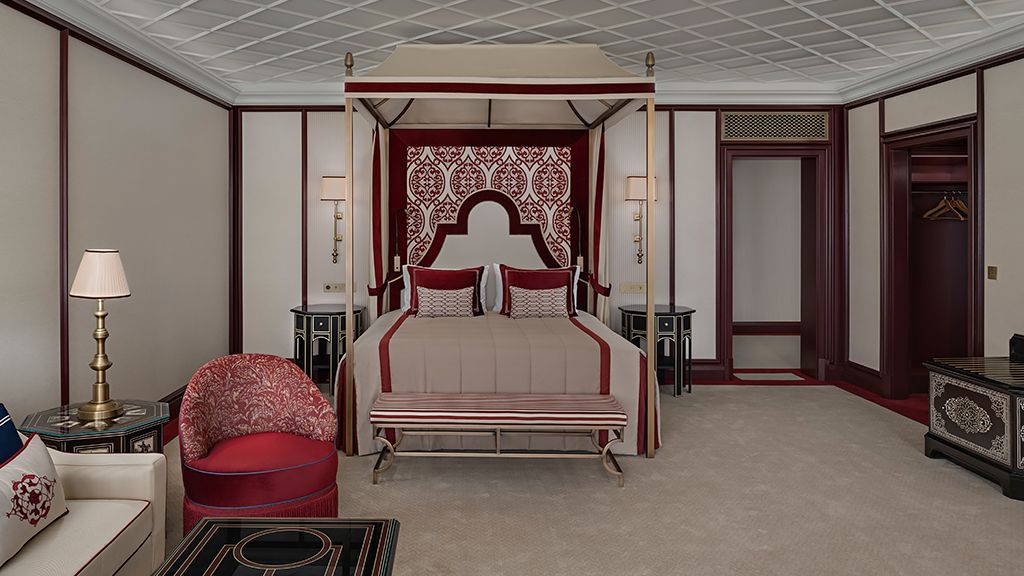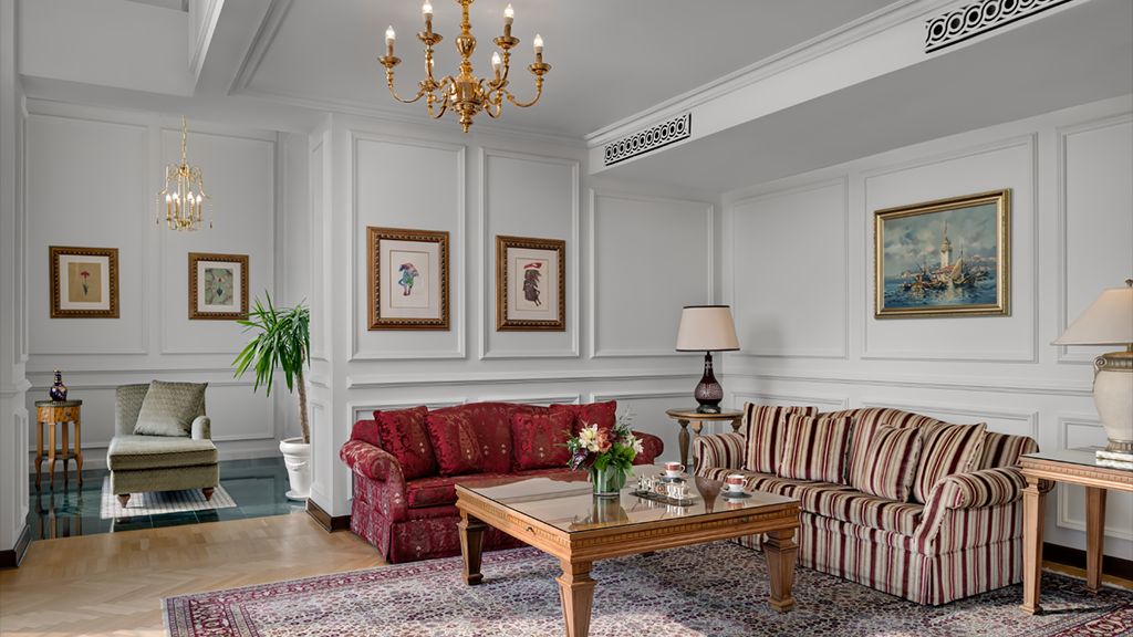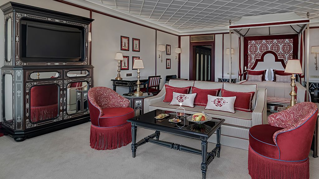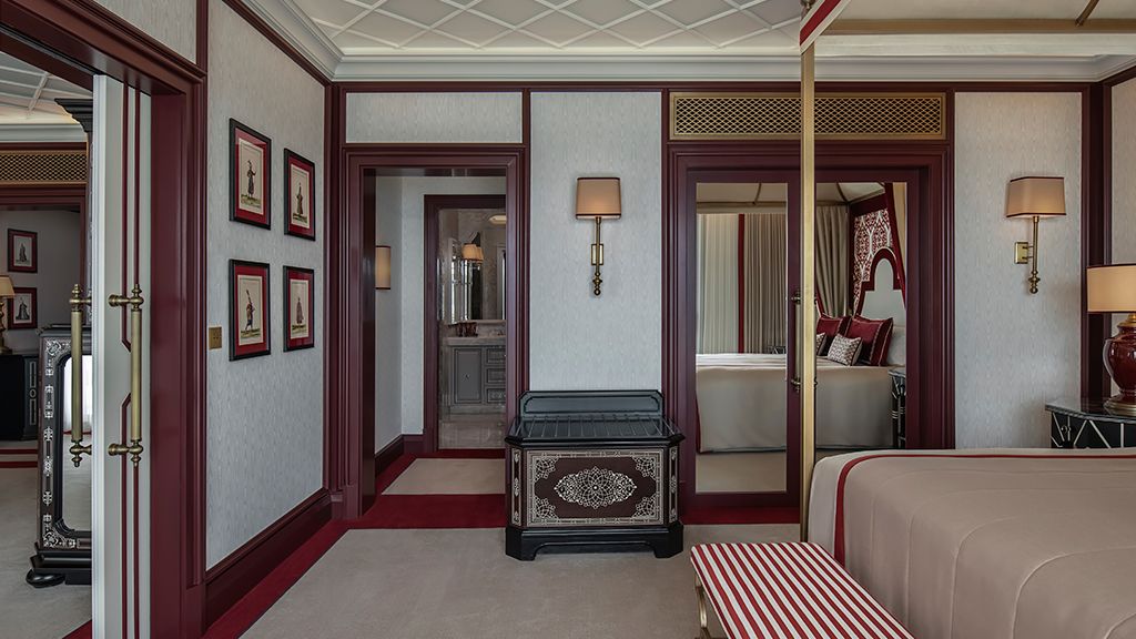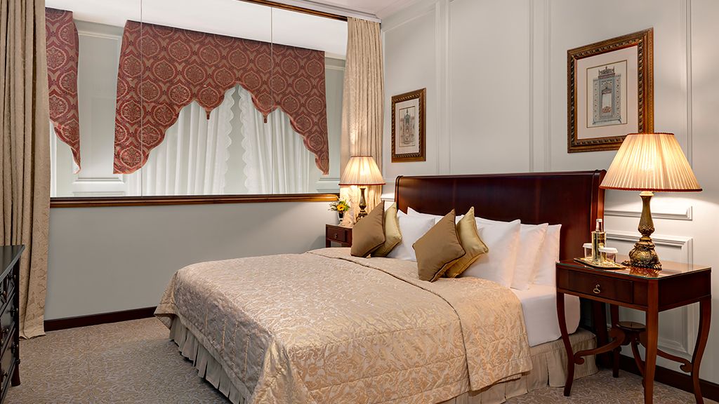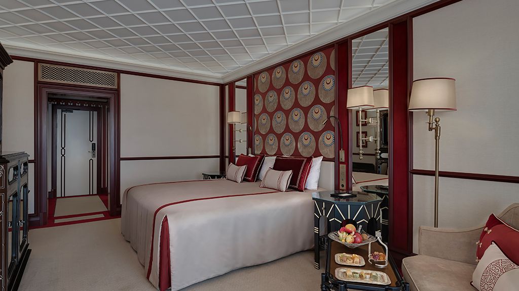 Bosphorus view - 1 King Bed. Totally redesigned with royal Ottoman architectural craftsmanship, these generously sized brand-new suites offer palatial elegance with an incredible Bosphorus vista. The suites have a specially crafted king-sized bed, a large balcony and a Turkish hammam-style marble bathroom. An elegant extended living room with lavish furniture creates a perfect combination of luxury and a stay of splendour.