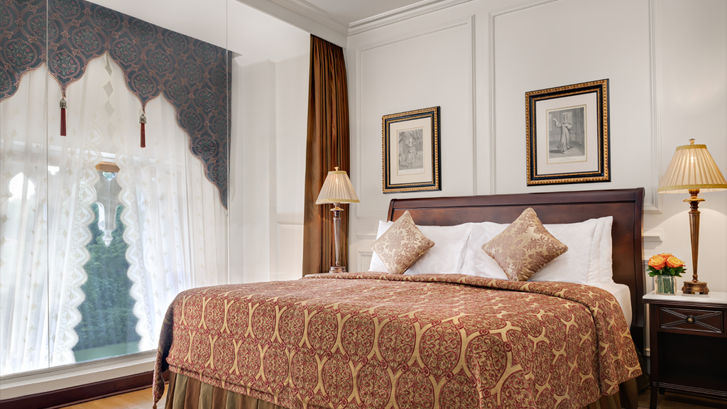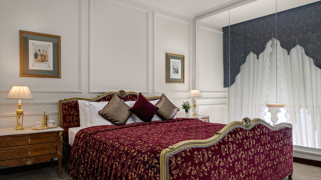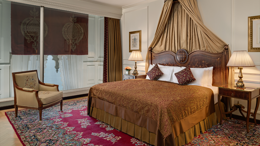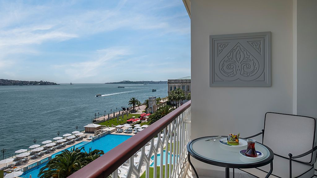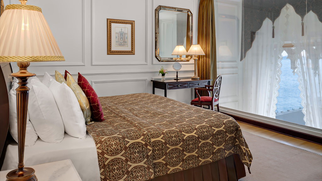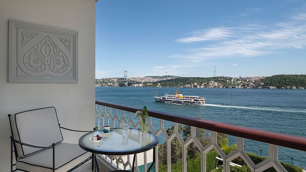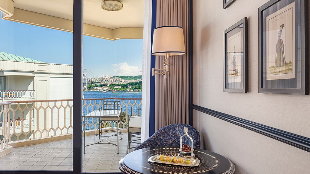 Bosphorus view - 1 King Bed. Offering timeless Ottoman glamour with authentic sophistication, these brand-new expansive rooms have direct views of the mesmerizing Bosphorus and are superb for an opulent stay. Located between the two wings of the hotel building, the elegantly redesigned rooms have a gracious king bed with Ottoman-figured fabrics, a spacious balcony, an elegantly designed seating area and a luxurious bathroom. *Please kindly be informed that the room view may depend subject to the assigned room location.