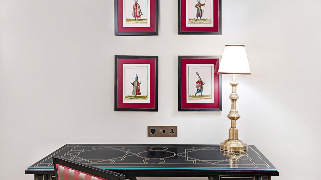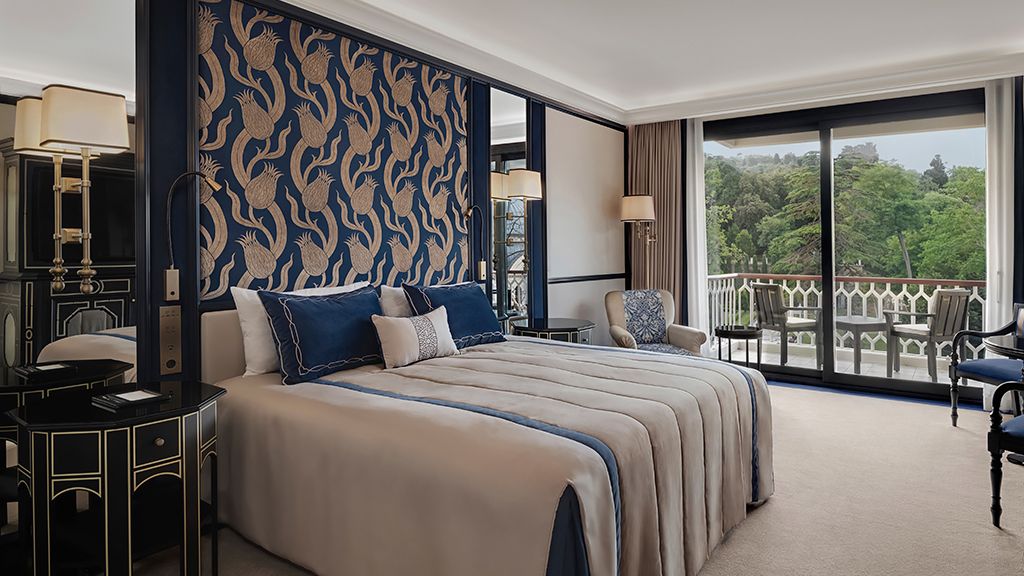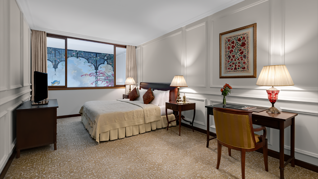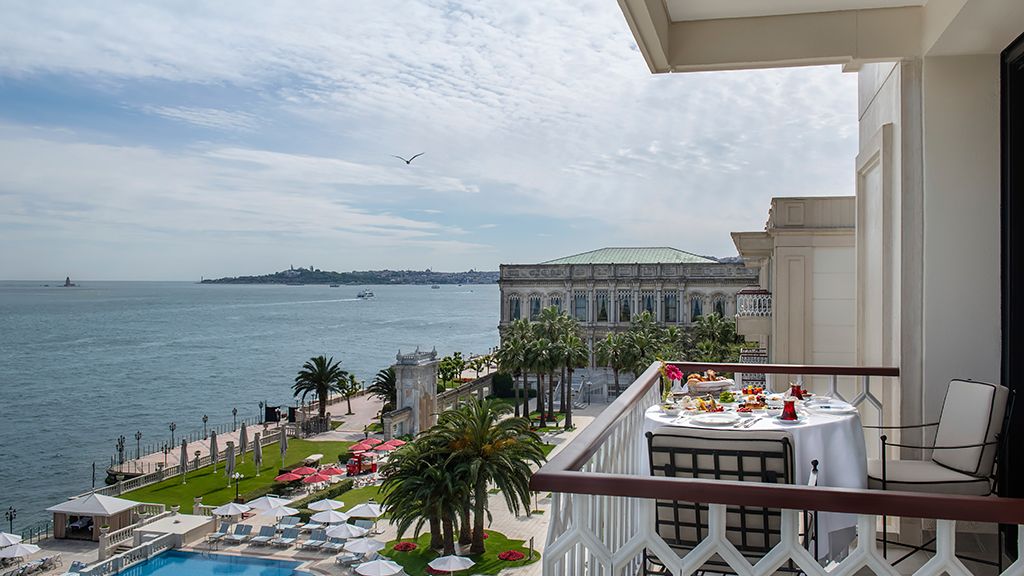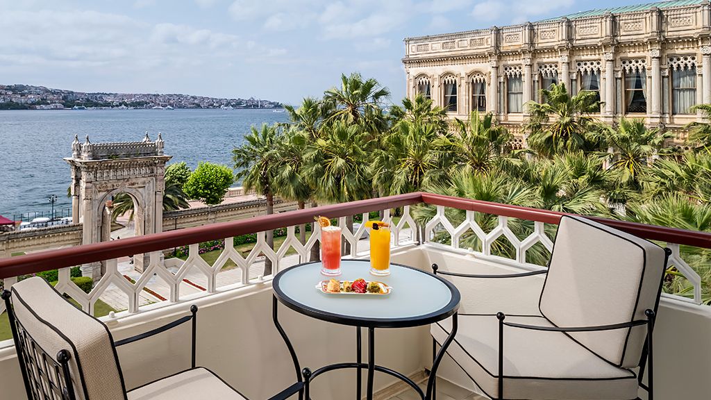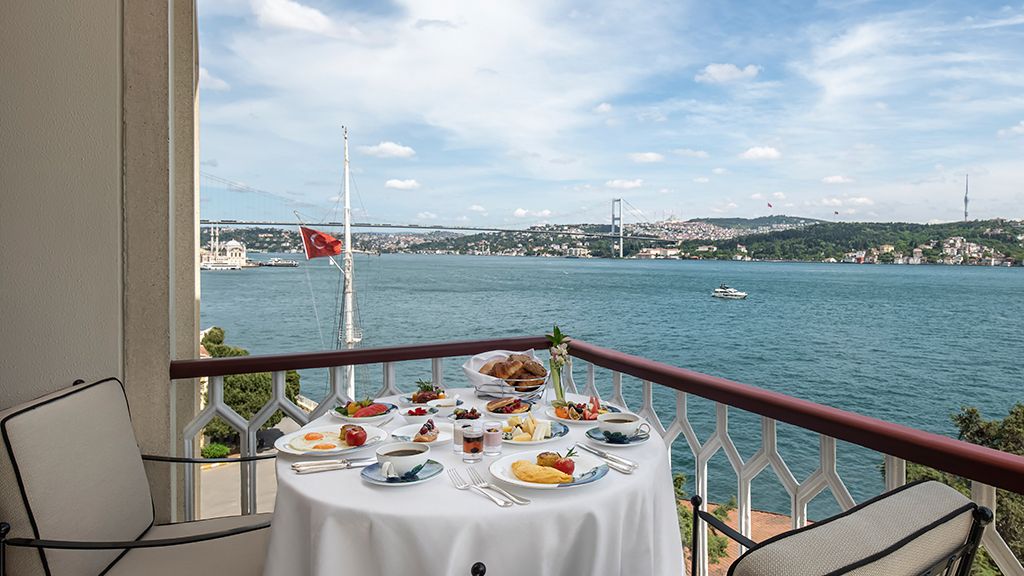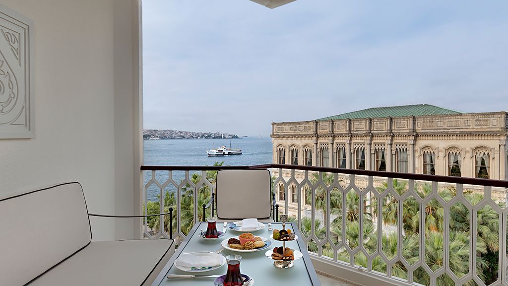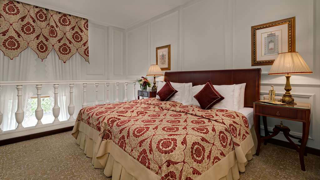 Bosphorus view - 1 King Bed. Offering timeless Ottoman glamour with authentic sophistication, these brand-new expansive rooms have direct views of the mesmerizing Bosphorus and are superb for an opulent stay. Located between the two wings of the hotel building, the elegantly redesigned rooms have a gracious king bed with Ottoman-figured fabrics, a spacious balcony, an elegantly designed seating area and a luxurious bathroom. *Please kindly be informed that the room view may depend subject to the assigned room location.