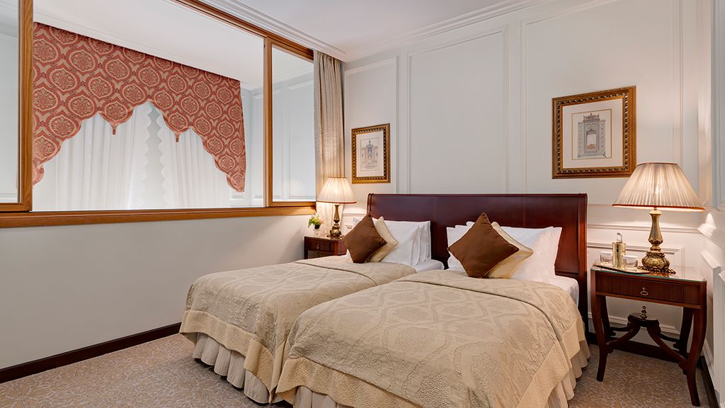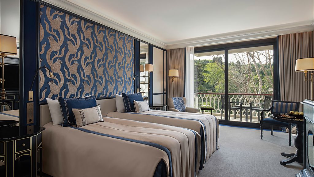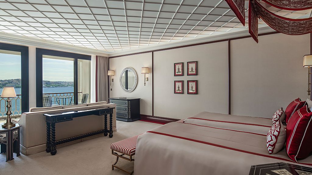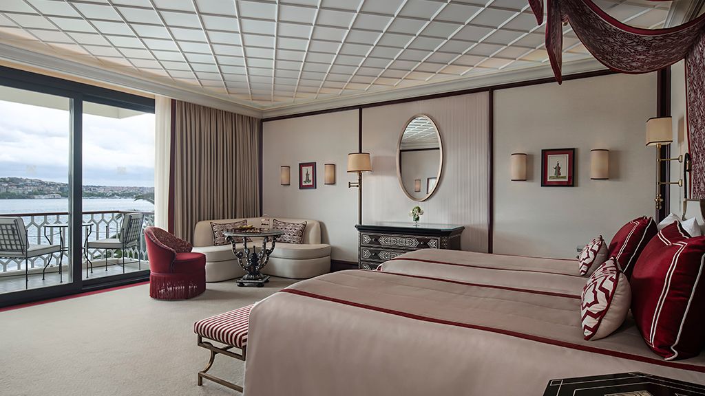 Bosphorus view - 2 Twin Beds. Offering timeless Ottoman glamour with authentic sophistication, these brand-new expansive rooms have direct views of the mesmerizing Bosphorus and are superb for an opulent stay. Located between the two wings of the hotel building, the elegantly redesigned rooms have a gracious king bed with Ottoman-figured fabrics, a spacious balcony, an elegantly designed seating area and a luxurious bathroom. *Please kindly be informed that the room view may depend subject to the assigned room location.