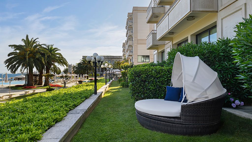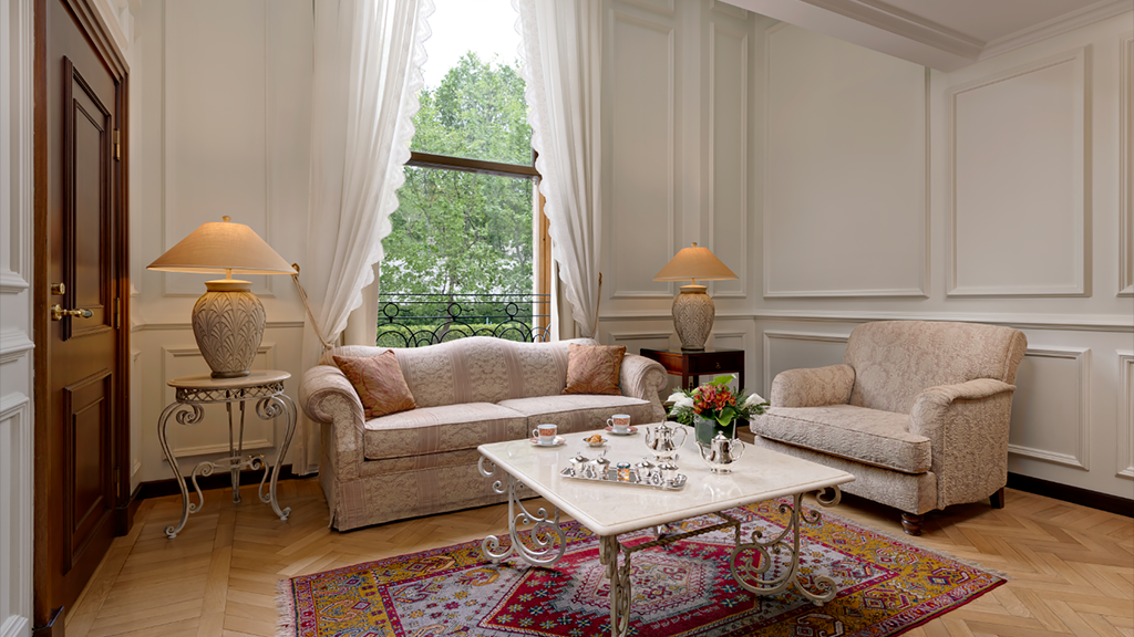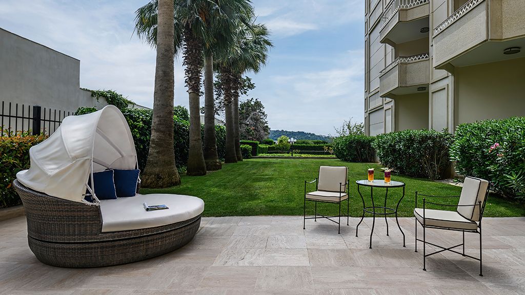 Garden view - 1 King Bed. Offering perfect tranquility, the freshly redesigned spacious Deluxe Garden Suites exude pure elegance and intimate atmosphere. Decorated with rich Ottoman heritage details these rooms feature, comfy king beds, an indoor sitting area, a Turkish hammam-formed marble bathroom, direct access to the lush green gardens and everything you require for a blissful and comfortable stay. The suite is located on the ground floor of the hotel building.