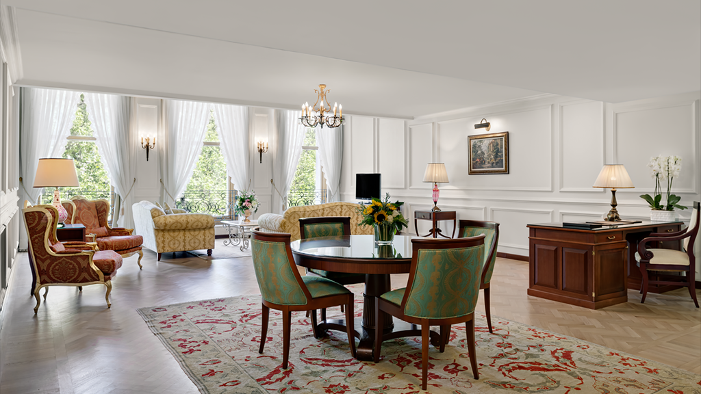 Bosphorus view - 1 King Bed. Palace Bosphorus duplex suites overlooking the Bosphorus are located in the historical palace. They have a separate living room and a bedroom. The bedroom on the upper floor has a private bathroom. The suites also have a living room with a seating area, a dining table for four, and a guest bathroom on the entrance floor.