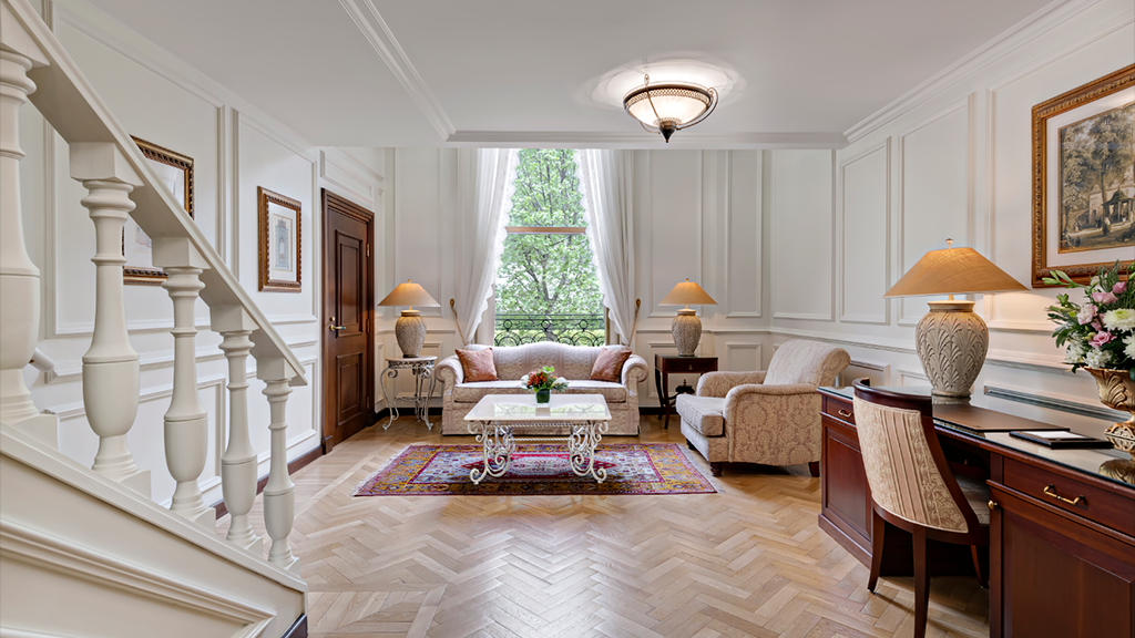 Bosphorus view - 1 King Bed, 2 Twin Beds. This is a unique residential duplex suite with large sash windows that brings views of the Bosphorus and the historical peninsula. The second biggest suite in the palace has a 115 square meter living room and a guest bathroom on the entrance floor. Three bedrooms on the upper floor all have separate bathrooms.