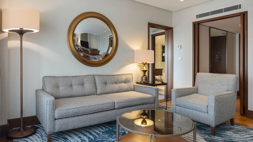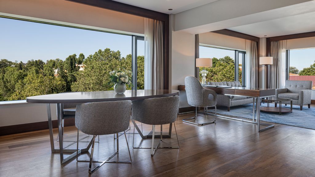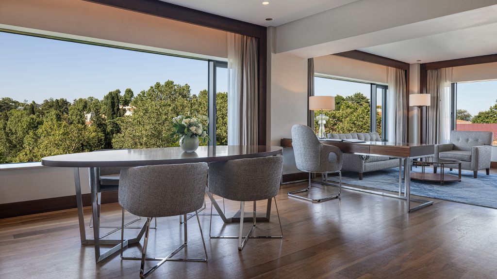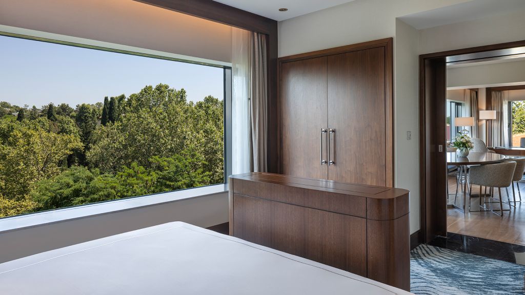 Suite with balcony with park views, lounge access, living area.