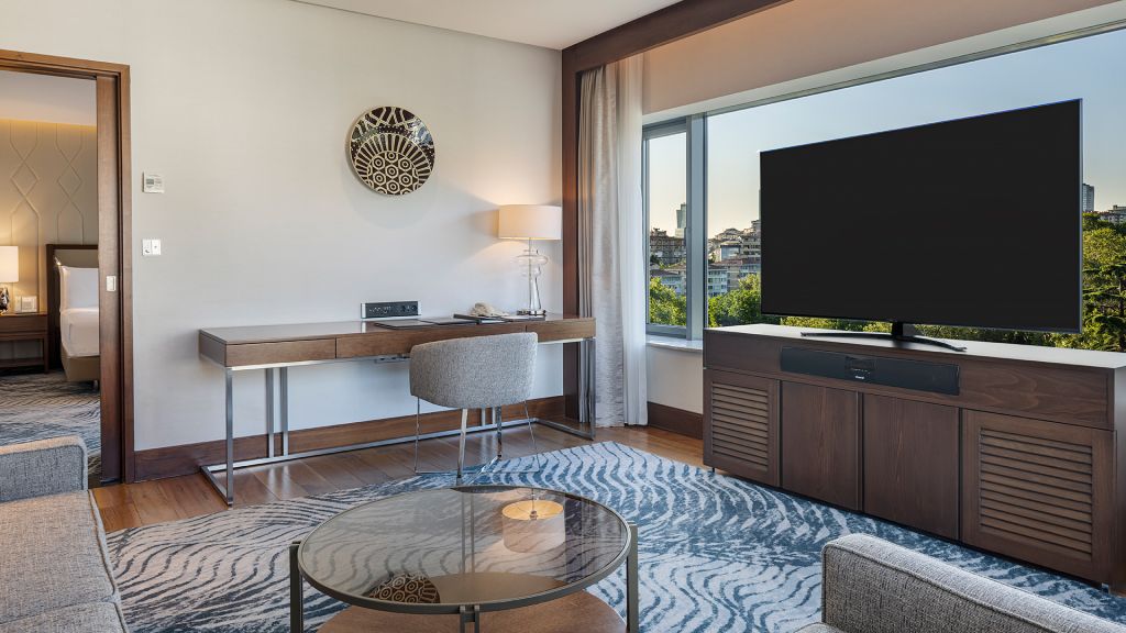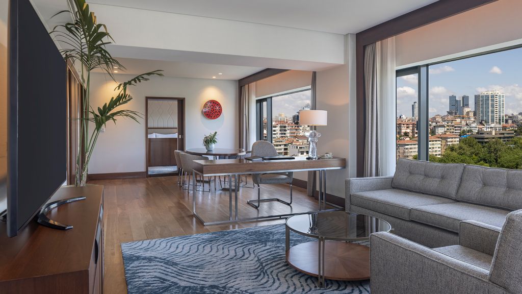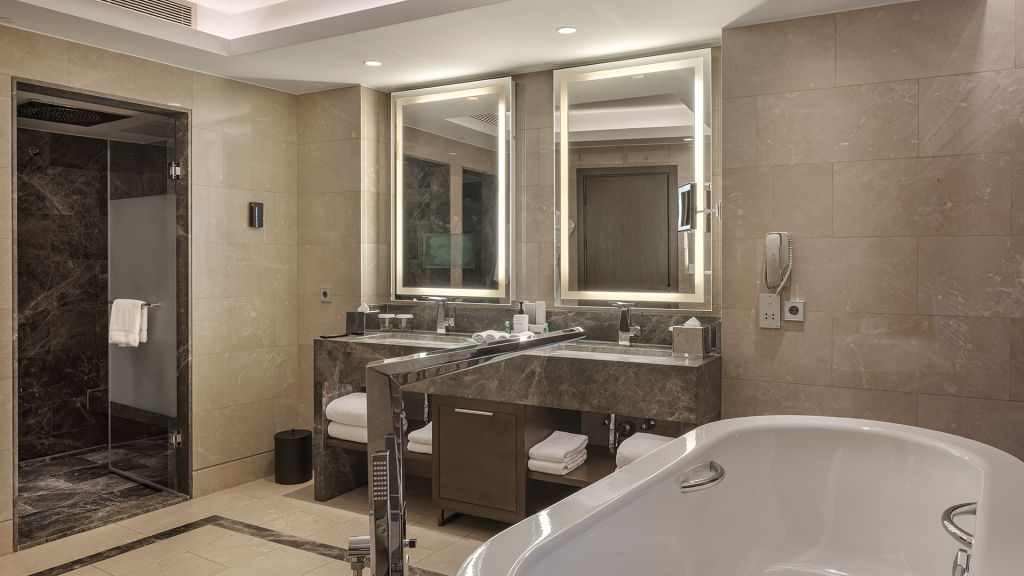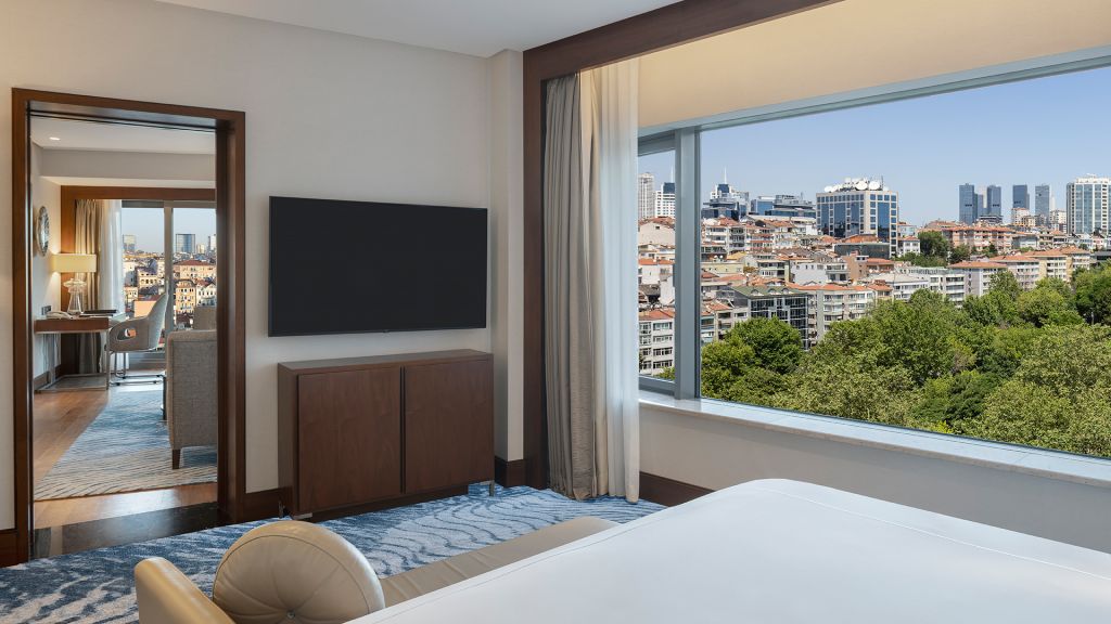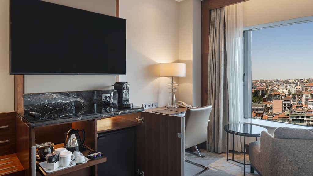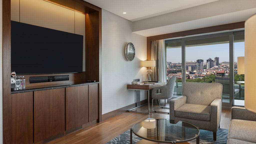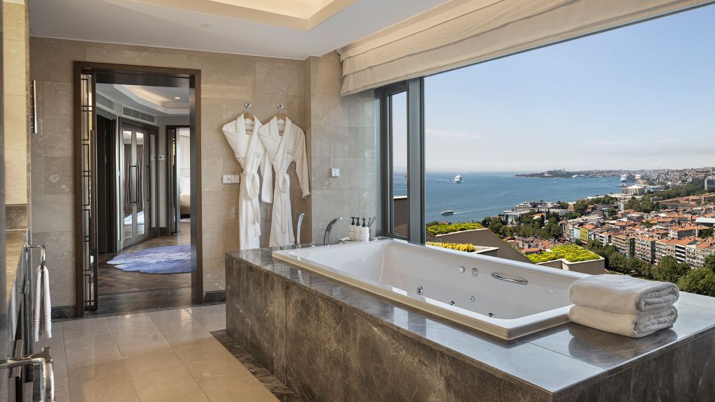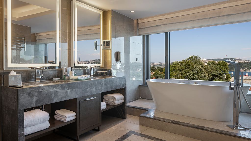 Spacious Suite with view of the Istanbul skyline, marble bathroom