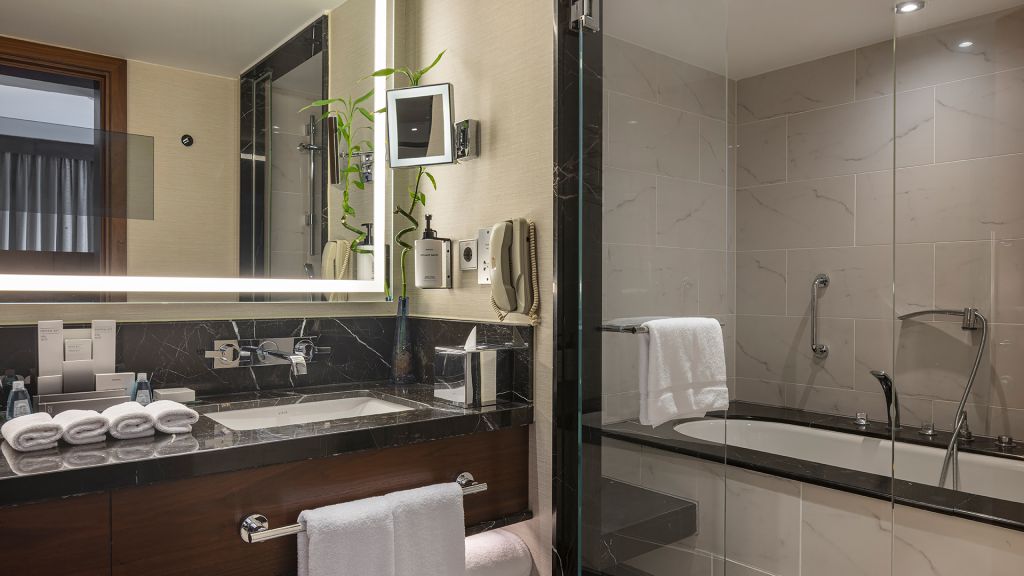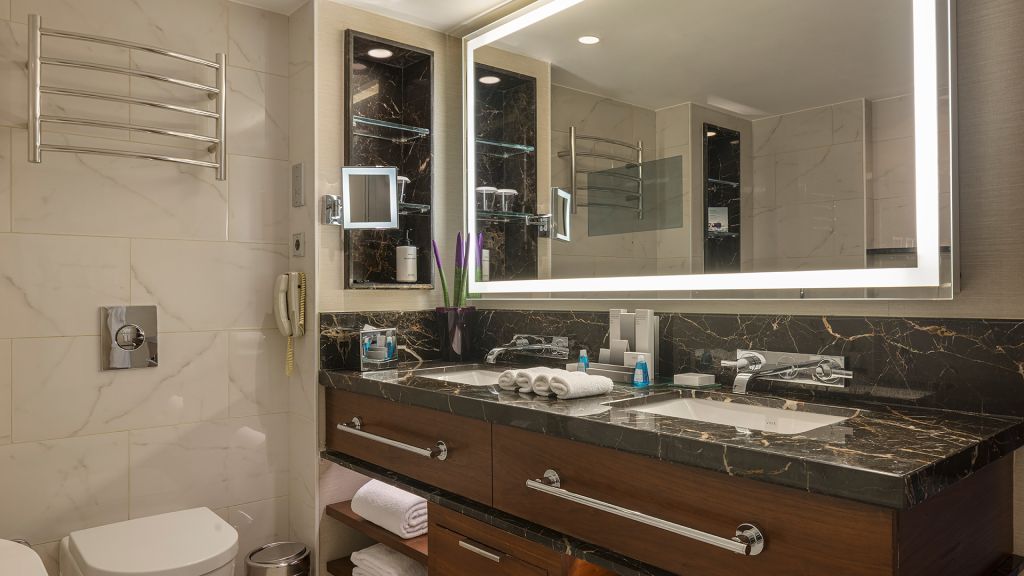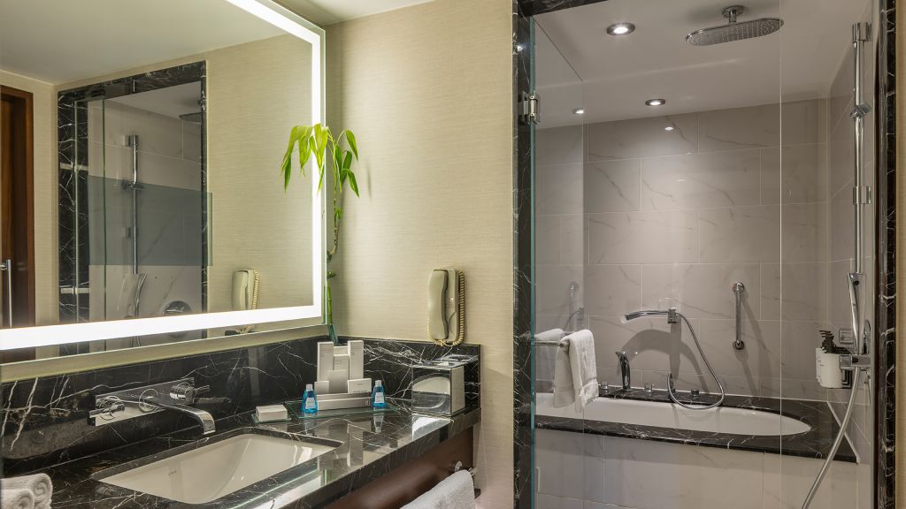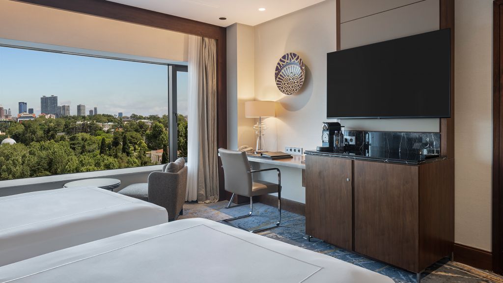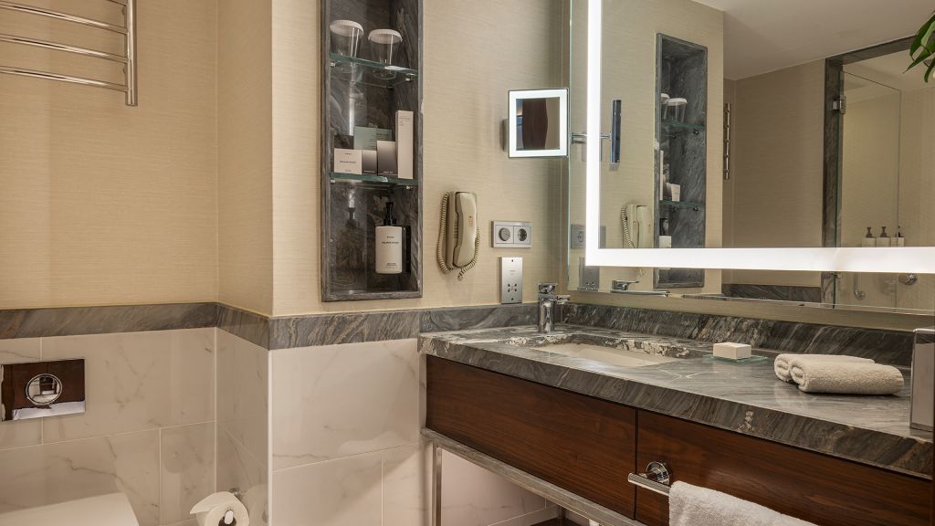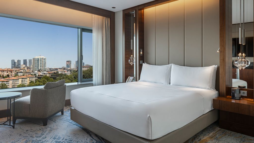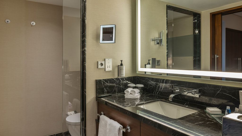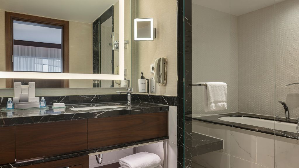 Spacious Suite with view of the Istanbul skyline, marble bathroom