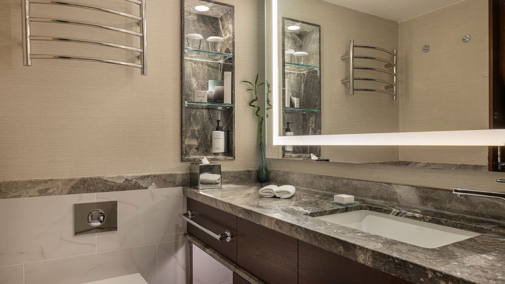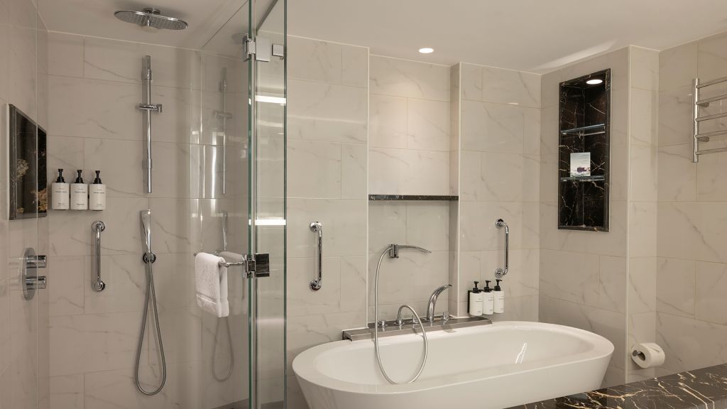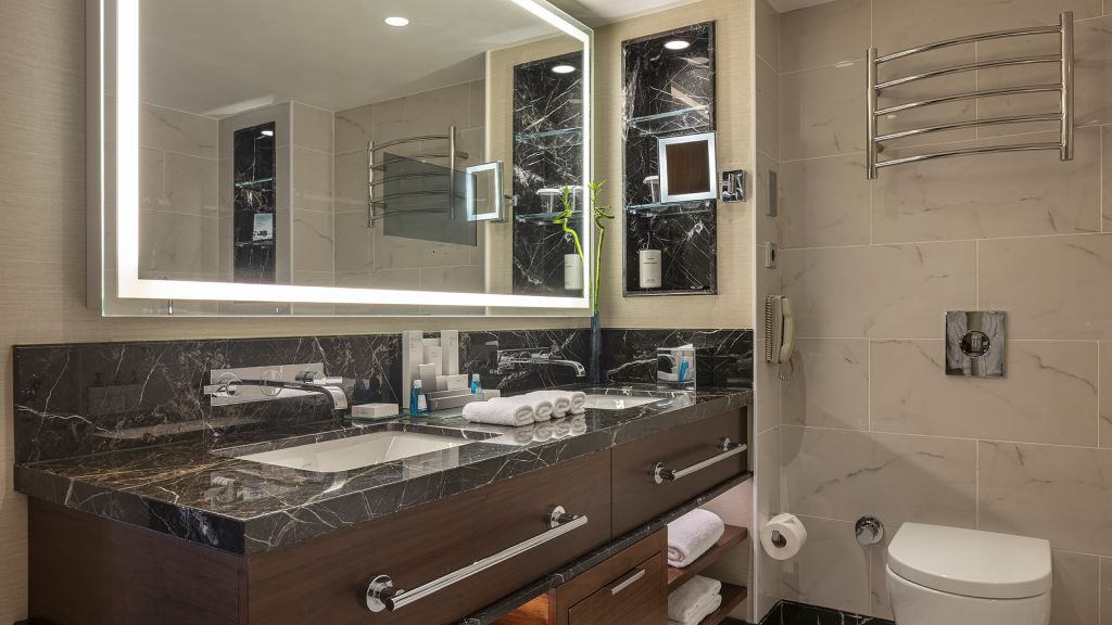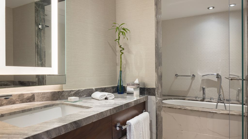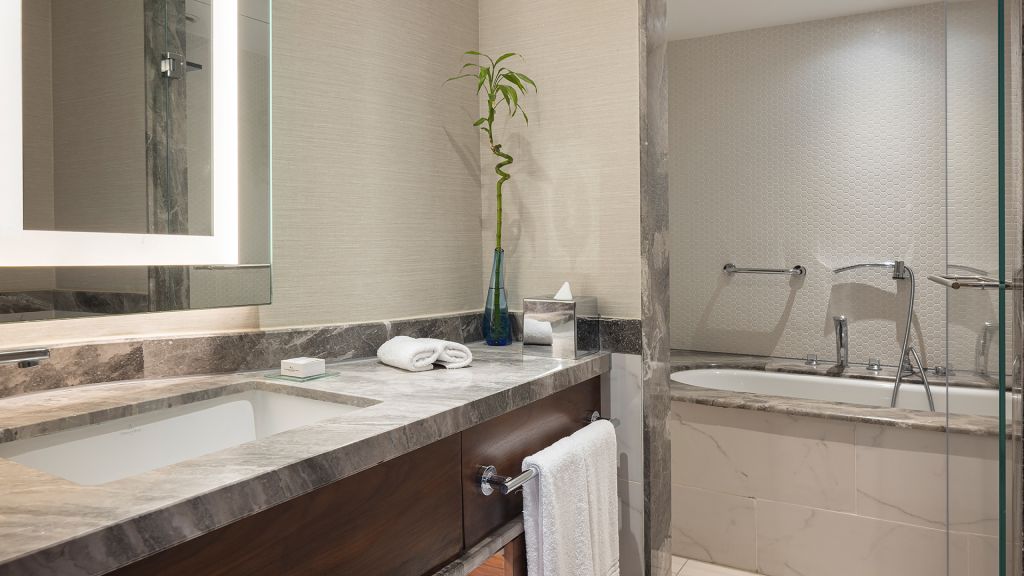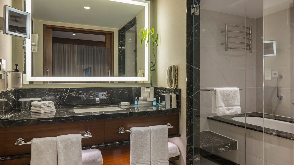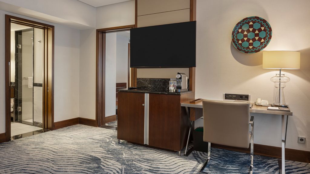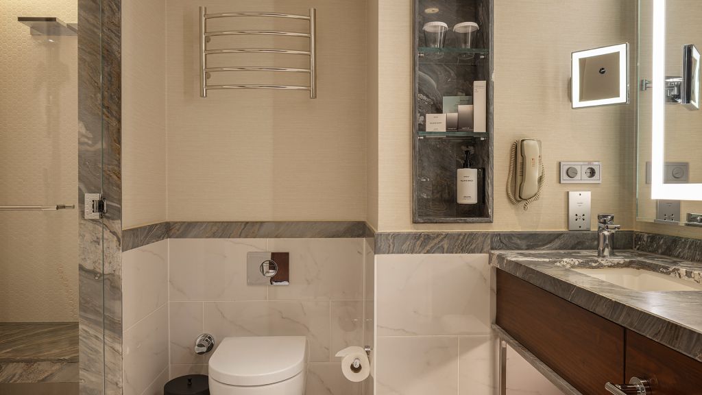Spacious Suite with view of the Istanbul skyline, marble bathroom