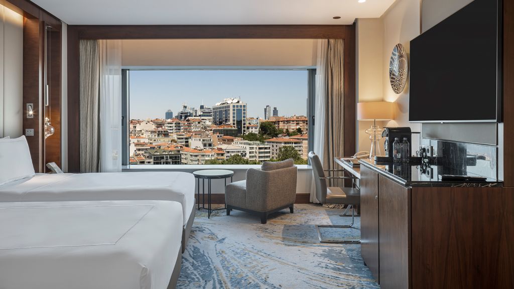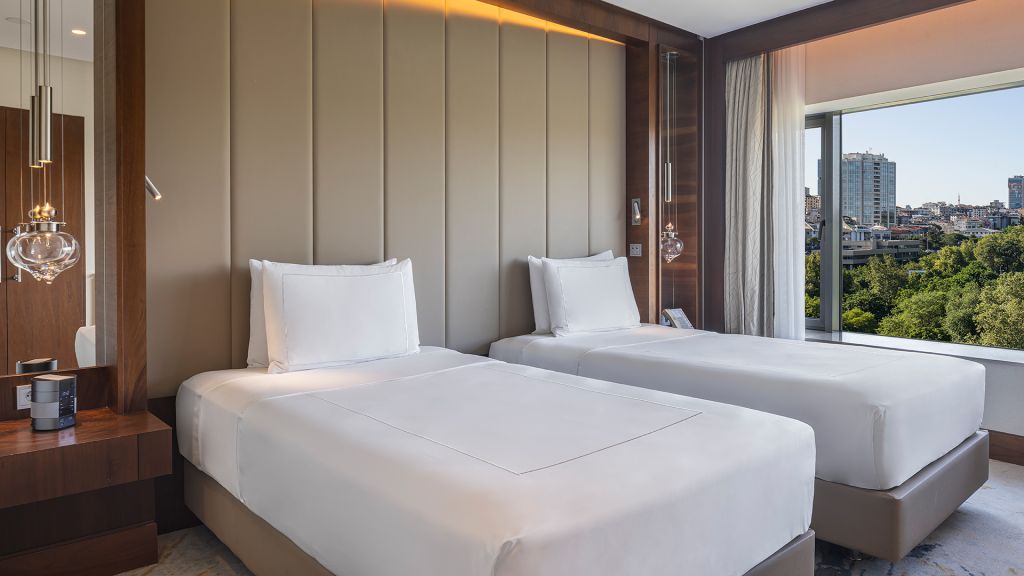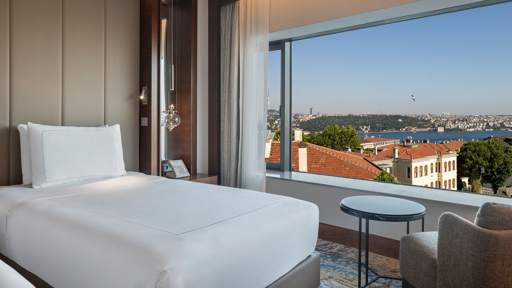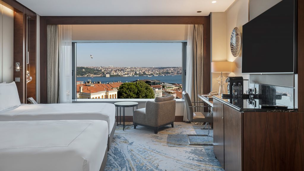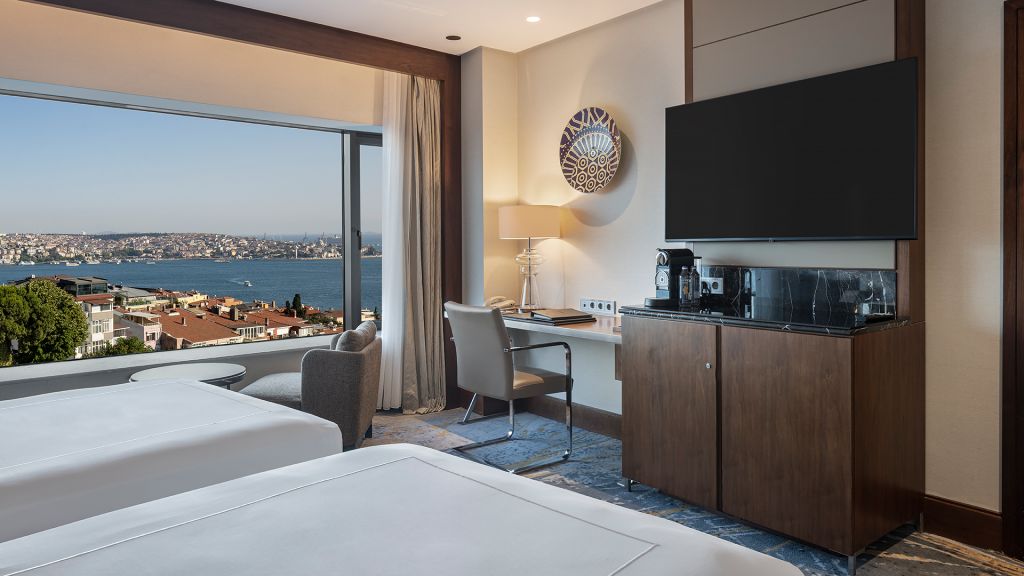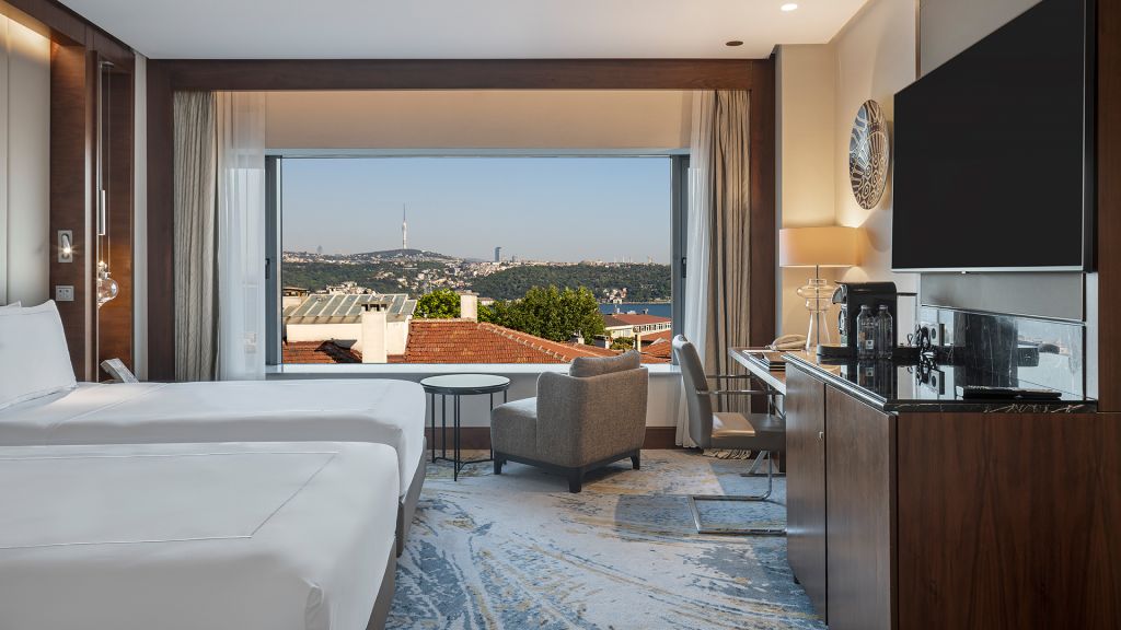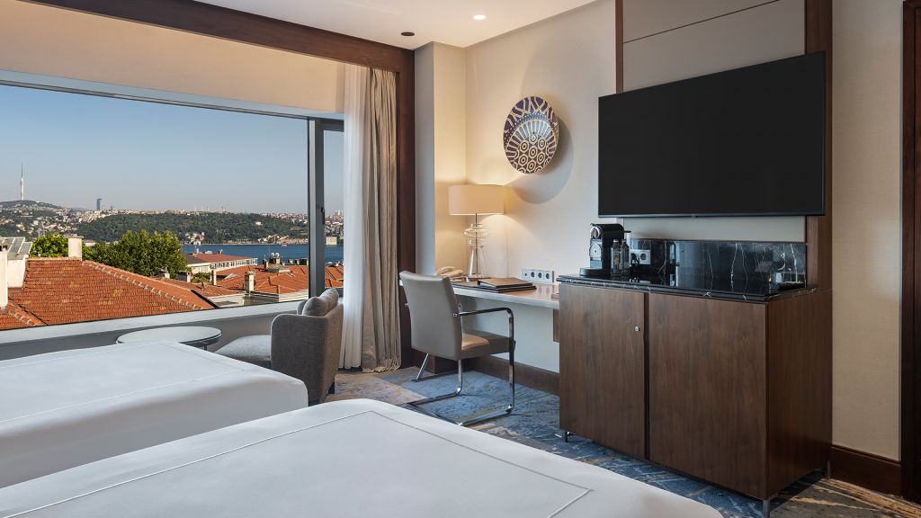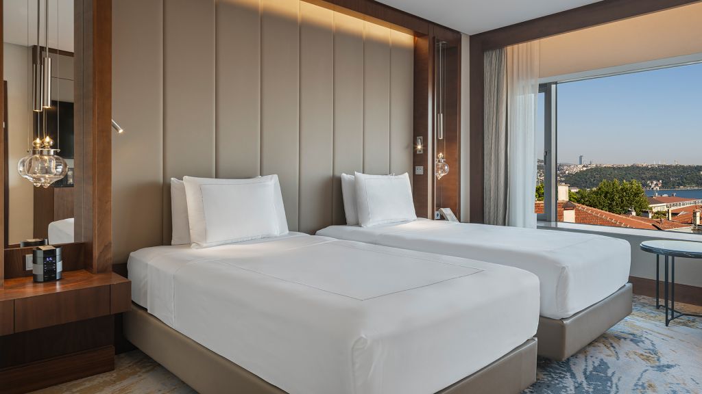 Room with twin beds, Nespresso machine, Wi-Fi, walk-in rain shower and Bosphorus view.