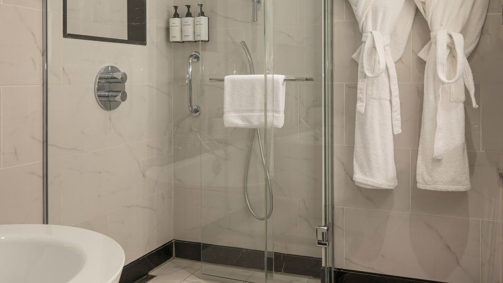 Room with king bed, Nespresso machine, Wi-Fi and walk-in rain shower.