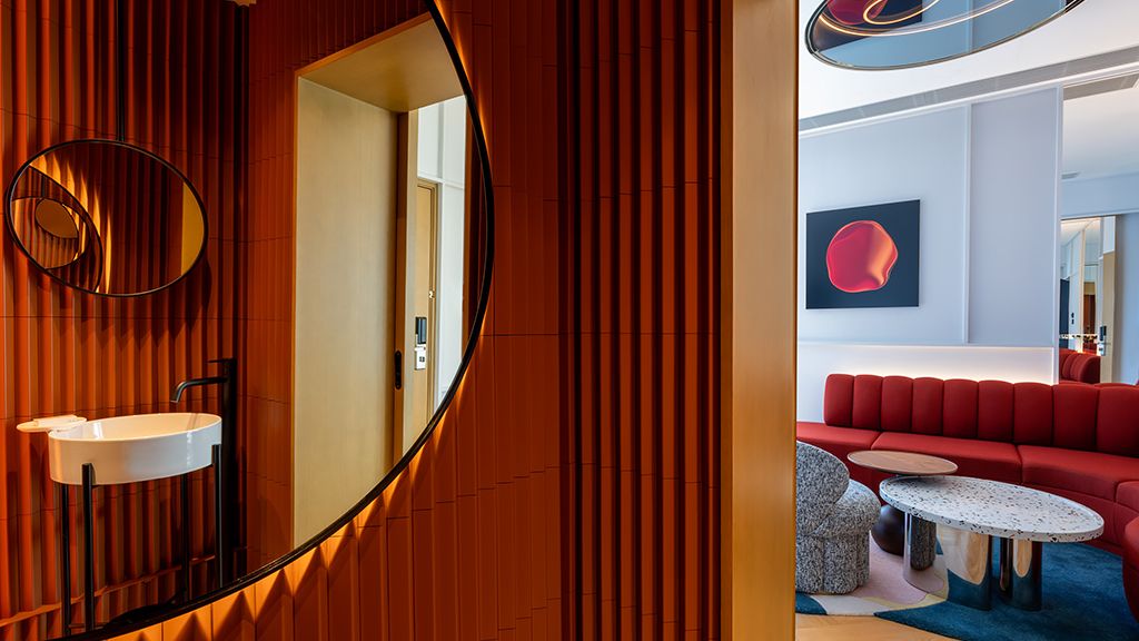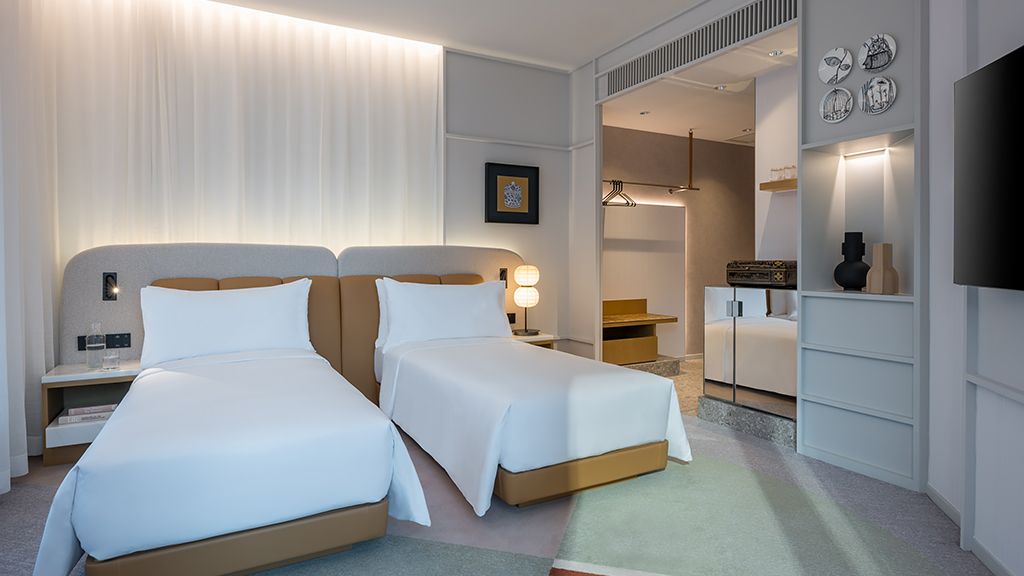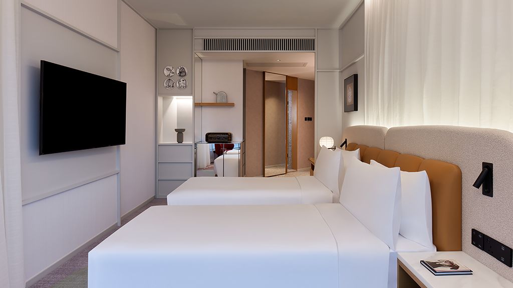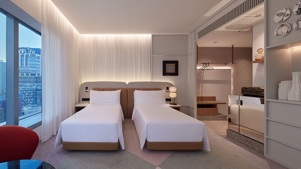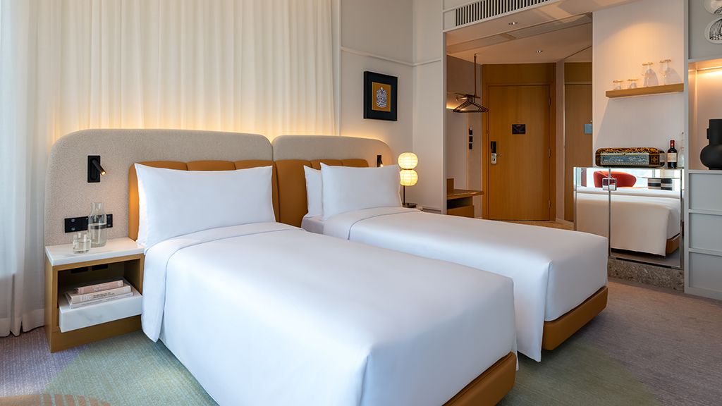 With high ceilings, soothing colours and vibrant city views, Deluxe Rooms have spacious interiors and rain showers – perfect accommodations for two guests. Twin beds.