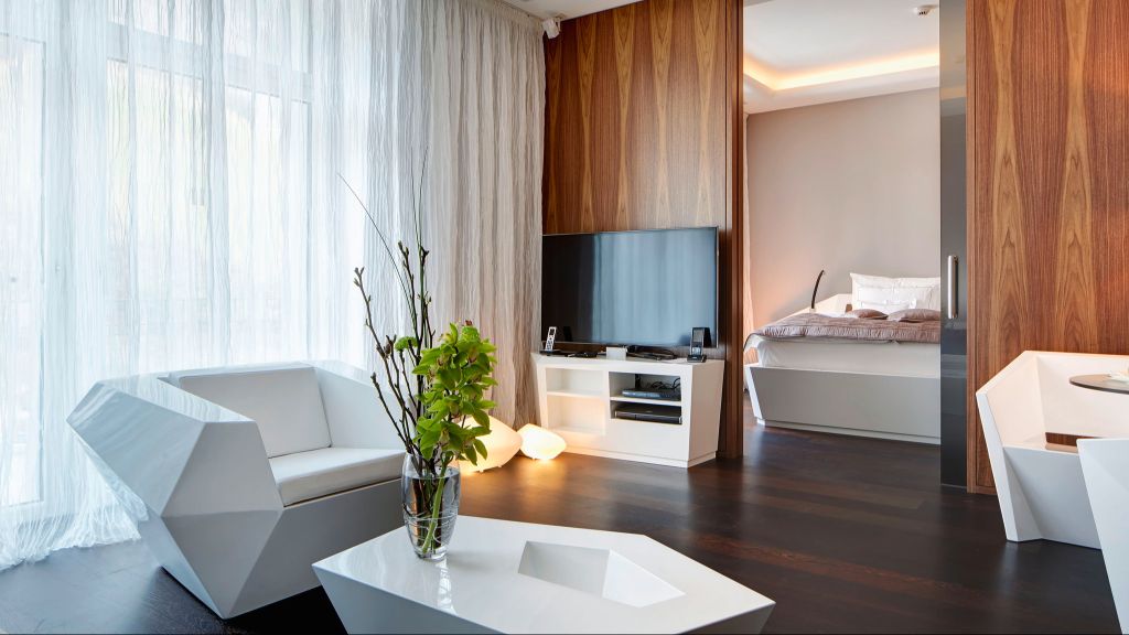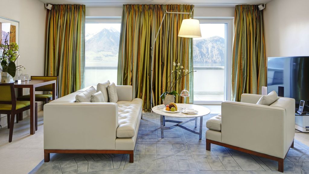 The deluxe suite with lake view features a separate living and sleeping area with king or twin bed, a bathroom with walk-in shower and bathtub, a separate guest toilet, and a balcony overlooking lake lucerne.