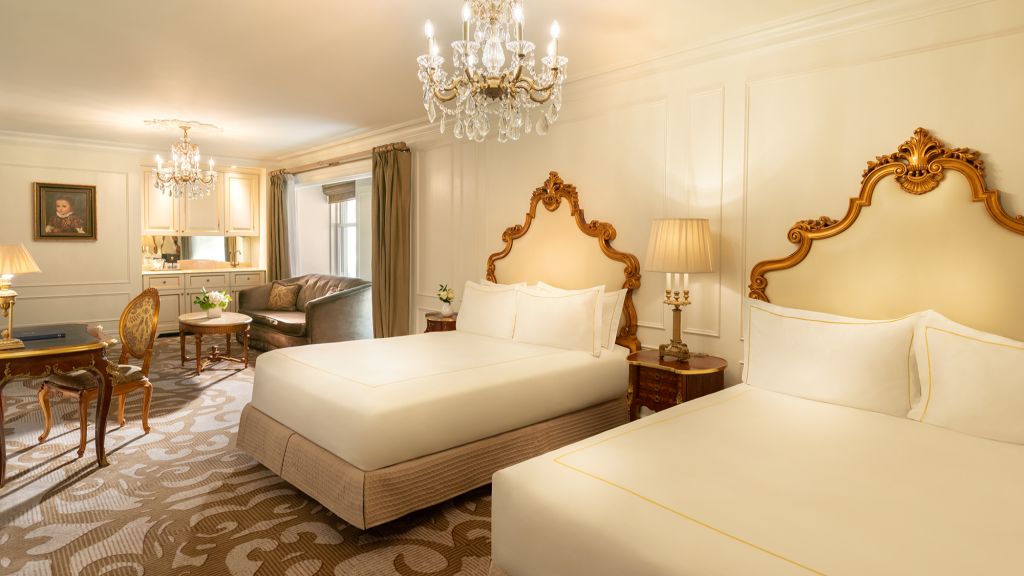 The Plaza’s expansive Deluxe King has one King bed and provide 550 sq. ft. of living space. Bathroom is finished with inlaid “earth stone” mosaics and include a luxurious bathtub and separate shower. Among many splendid details are 24-carat gold-plated Sherle Wagner fixtures, as well as hand-crafted solid white marble vanities. Rollaway bed allowed.