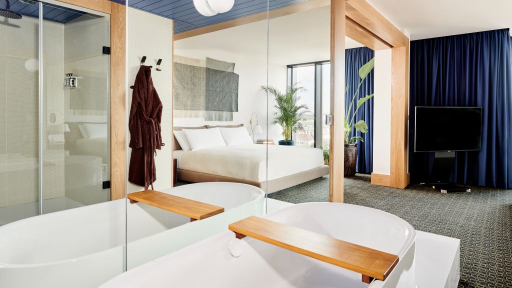 If you’re here, you’ve hit the Suite Spot. Irresistibly spacious, this suite is 80 square metres (861 square feet) with floor-to-ceiling windows, an emperor-sized bed, a bar for entertaining and a bathtub like no other. The Suite Spot features abundant natural daylight and triple-glazed floor-to-ceiling windows for a quiet night’s sleep. Make yourself at home with 24-hour room service, fluffy down pillows, fancy sheets, bespoke bathrobes, a Bang & Olufsen Bluetooth speaker and a minibar, overstocked with tasty treats. As a suite guest, you can also get a Peloton bike delivered directly to your room on request, a Stutterheim raincoat for use across your stay, complimentary sneaker cleaning service, turndown service and yummy minibar additions.