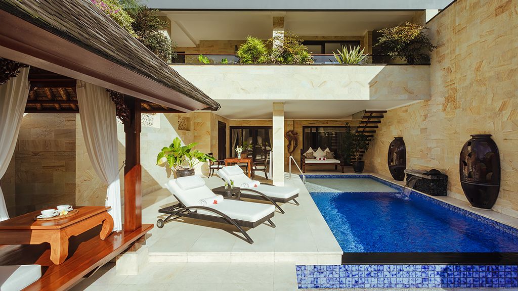 Terrace pool villa's have a traditional balé perched elegantly over the... Ler mais